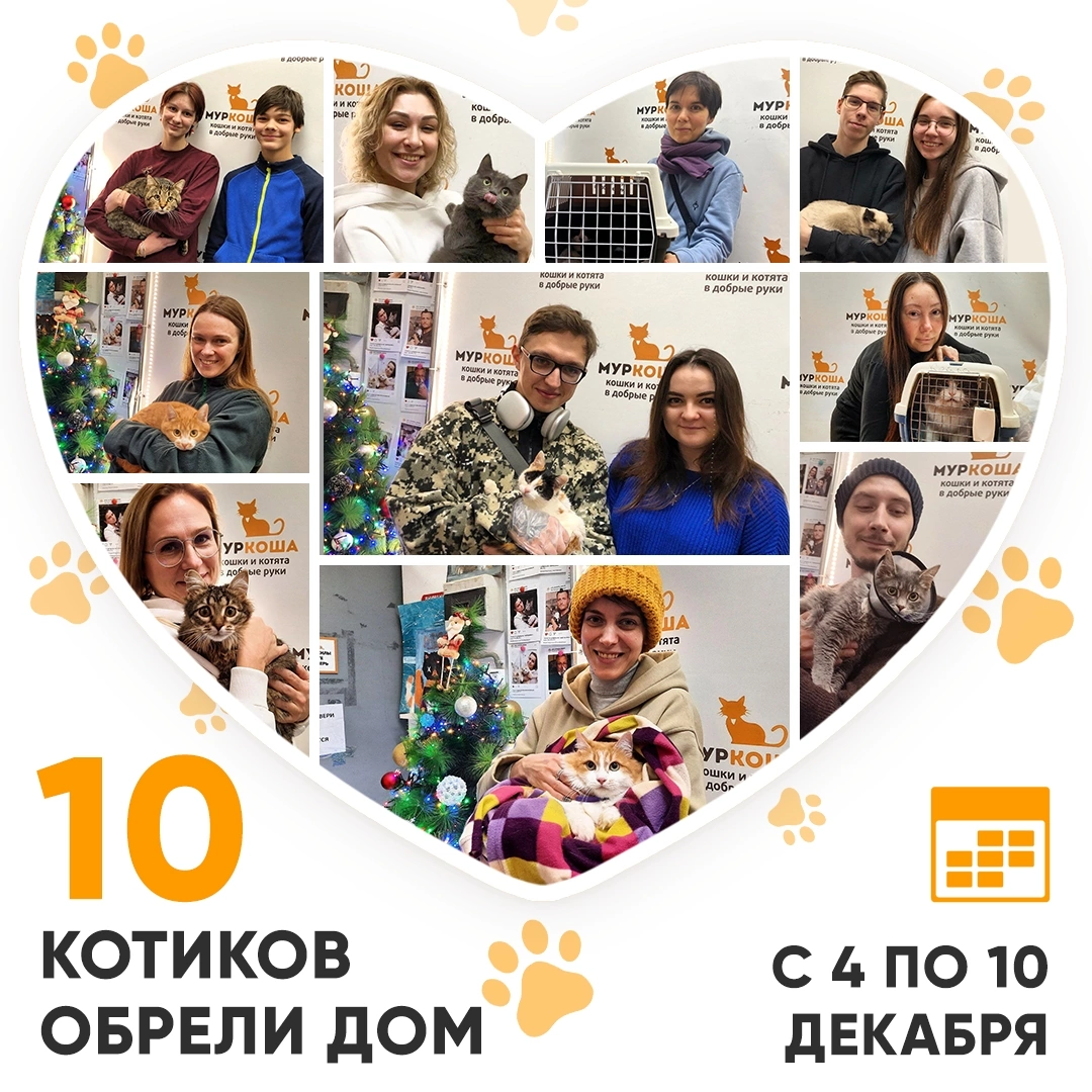 Друзья! Сегодня среда, и мы, как обычно, подводим итоги работы «Муркоши» за прошедшую неделю! Кто же стал счастливым выпускником Центра помощи кошкам «Муркоша» с 4 по 10 декабря 2023 года? 😺 🥳 Итак, за прошедшую неделю домашними и любимыми стали 10 котиков! 1. Котенок-девочка Дарюша, 10 месяцев У Дарюши все хорошо. 🥰 2. Кошка Шушка, 2.4 года Шушка, первый привет из дома: «Освоение территории у товарища Ш. продвигается довольно медленно. Но уже виден характер. Боевой, хулиганистый, даже шкодливый (от поглаживаний быстро переходим к покусыванием и поцарапываниям). От больших проблем видимо нас спасает ... трусоватость упомянутой персоны. Вылезает она из-под кровати буквально пару раз погладиться, и снова - шмыг…» 🥰 3. Котенок-мальчик Лайт, 7 месяцев 4. Котенок-девочка Виорика, 6 месяцев 5. Кот Компотик, 4 года 6. Котенок-мальчик Атхит, 9 месяцев Первый фотопривет Атхита из дома. 🥰 7. Кошка Эмлерия, 2 года 8. Кошка Митральеза, 5 лет Первый фотопривет из дома. 🥰 9. Котенок-девоч