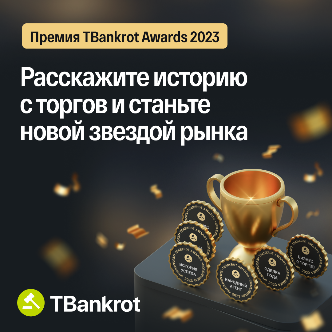 TBankrot Awards — премия лучшим участникам торгов, которая подтверждает экспертность на рынке. ⭐ Мечтаете встать в один ряд с легендами торгов Аленой Лушниковой и Вадимом Куклиным? Тогда дерзайте! ✍️ Расскажите о своей самой захватывающей сделке этого года — будь то впечатляющий доход или дача для любимой бабушки 👉 https://clck.ru/36xYqC 🏆 В этом году будет 6 победителей, так что у каждого есть шанс засиять на сцене: ☝ Чем больше историй расскажете, тем больше шансов на победу. 🎁 Все, кто поделится своей историей, получат: 🥇 Победителей премии наградим: 📆 Успейте поделиться своей историей до 31 декабря 2023, чтобы не просто быть зрителем, а стать главным героем этого события! Подробности по ссылке 👉 https://clck.ru/36xYqC
