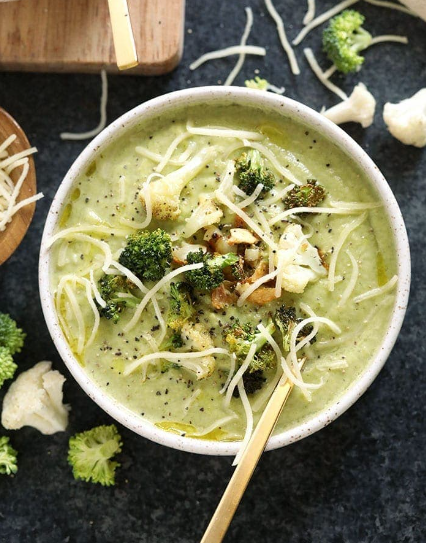 Восхитительно густой и питательный сливочный суп, готовится менее чем за 30 минут. Для более эффектной подачи, посыпьте крем-суп молотым черным перцем, тертым сыром и несколькими жареными соцветиями брокколи и цветной капусты. Ингредиенты: Способ приготовления: 1. Разогрейте духовку до 200 С. 2. Выложите цветную капусту, брокколи и зубчики чеснока на противень. Сбрызните сверху 3 столовыми ложками оливкового масла и перемешайте, чтобы овощи были полностью покрыты. 3. Запекайте овощи при температуре 200 С около 20 минут или пока брокколи не начнет подрумяниваться. 4. Пока овощи готовятся, в кастрюле обжарьте желтый лук примерно в 1 столовой ложке оливкового масла со щепоткой соли. Как только он станет мягким и полупрозрачным, влейте овощной бульон и дайте покипеть несколько минут. 5. Переложите все ингредиенты в высокоскоростной блендер (включая сыр). При желании отложите пару жареных соцветий для украшения. 6. Взбивайте около минуты, превращая овощи в пюре, чтобы получить крем-суп. Кон