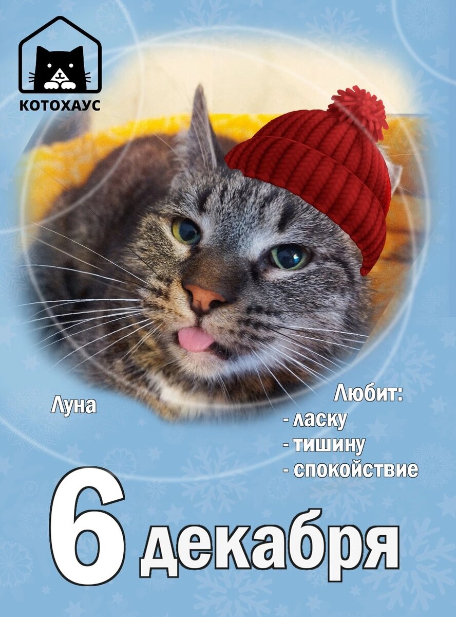 Стеснительная и незаметная Лу́на мечтает об одном - быть рядом с Человеком... Ведь это так прекрасно: смотреть вместе "Ирония судьбы или с легким паром!", в праздничной суматохе поддерживать спокойствие и уют своим присутствием, а если и отдыхать, то тоже вместе!