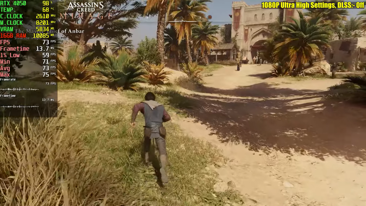 Assassin's Creed Mirage запускалась с ультра-высокими настройками и DLSS Off. В среднем в ней удалось достичь 73 к/с, максимум - 75 к/с, минимум - 67 к/с.