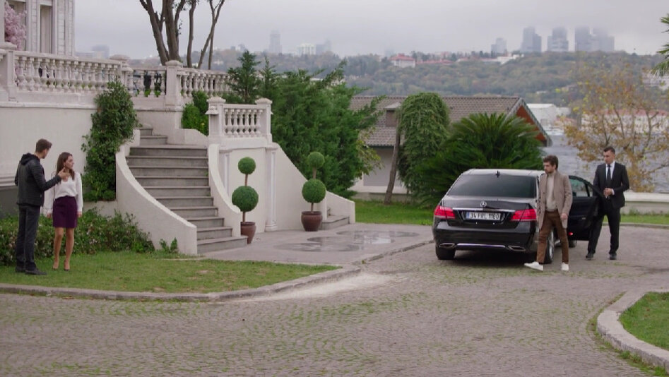 К особняку Карачай подъезжает такси из которого выходят Нариман и Джерен. Охранники достают из багажника машины, чемоданы Джерен и Нариман.