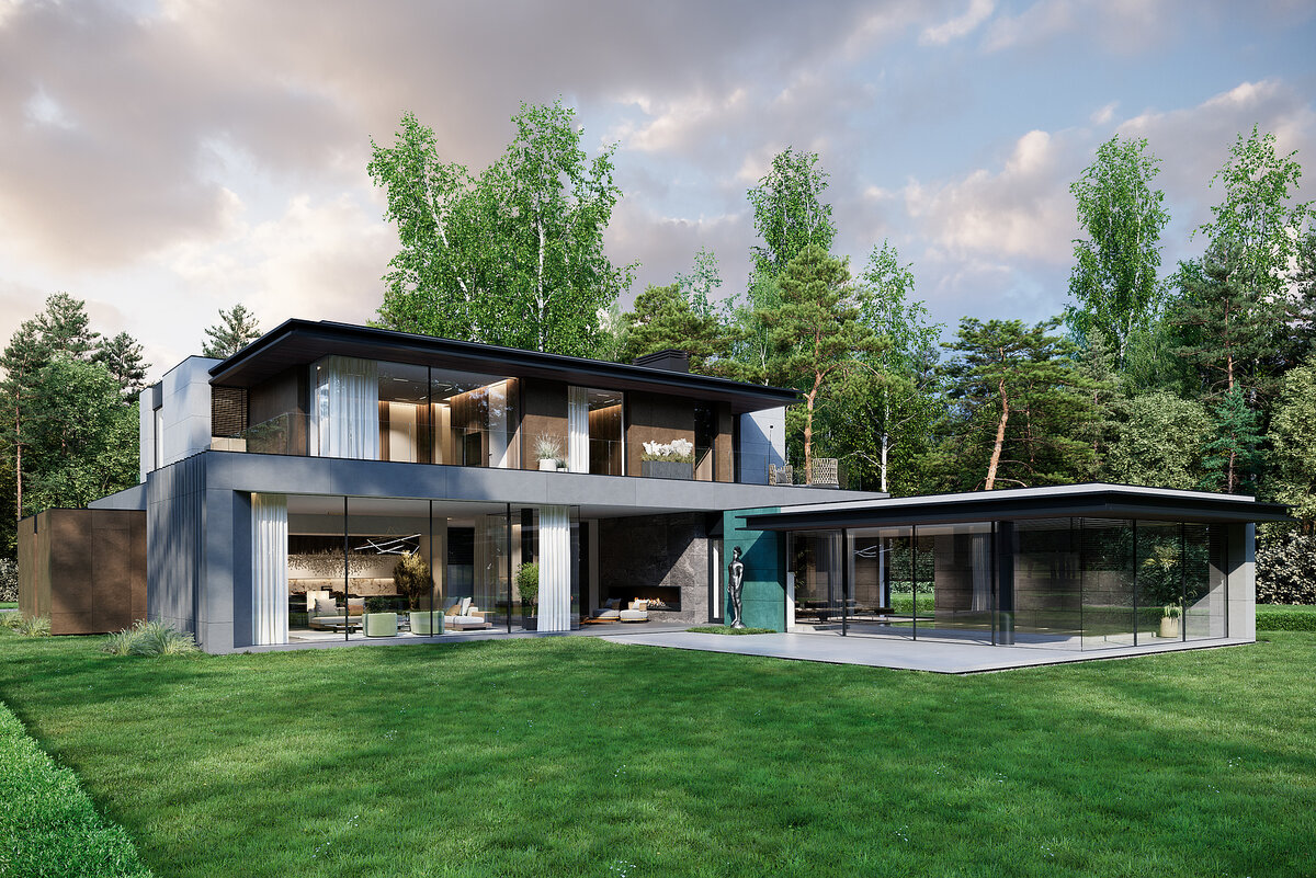 Мы продолжаем знакомить вас с нашими типовыми проектами. Вилла «Альфа» — двухэтажный коттедж в современном стиле с панорамным остеклением и гаражом на два автомобиля. В отделке фасада использованы разные цвета керамогранита — белый, серый, под мрамор и под кортен, а также черный и темный алюмокомпозит, патинированная медь.
