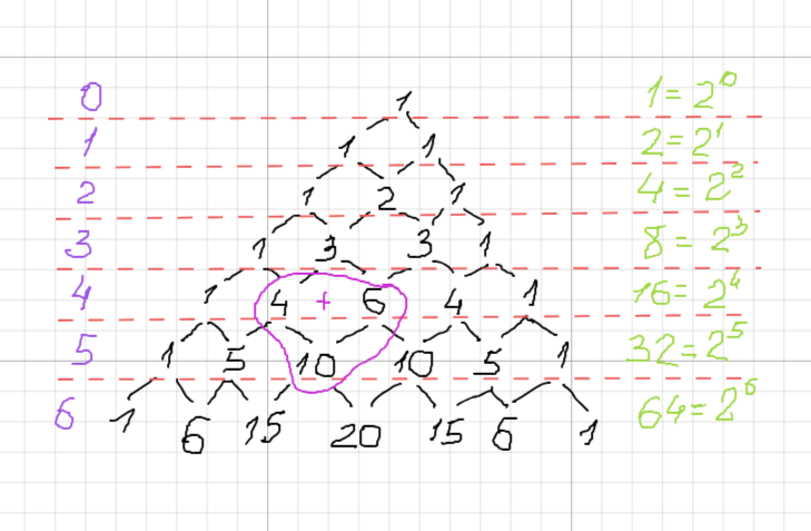 г) 2048. Для решения этой задачи используем треугольник Бернулли. Если не помните, в этом треугольнике каждое из чисел является суммой двух верхних, смежных по диагонали, чисел (на картинке обведено сиреневым цветом для примера), по краям всегда единички. Сумма чисел в каждом ряду - это общее число элементарных событий, а номер ряда - это число испытаний, при этом нумерация начинается с нуля. Знаете ли, почему нумерация с нуля? Заметьте, что в каждом ряду сумма чисел является последовательностью 2 в степени n (зеленым цветом слева от пирамиды, посмотрите). А нумерация строк - это и есть те самые степени. По треугольнику Бернулли получается, что если проведено 4 испытания, то число элементарных событий равно 16. Тогда получается для решения этой задачи нам нужно найти степень числа 2: Ответ: а) 4; б) 6; в) 8; г) 11.