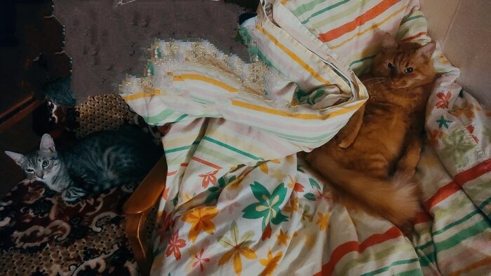 Оба помойные... Рыжего принесла соседка найденного на дачах поздней осенью кота "поиграться", пока не надоест... 10 лет в тапки уже... Велик орал летом ночью под машиной "потерявшись"... еле поймал с помощью всего семейства, швабры и двух веников этого дикаря через два дня... прокусил палец и получил по морде от Рыжего, опять же до крови, когда тот учуявший запах новичка ошалевший вылетел в коридор... по "науке" (ролики в Ютюбе) приручили их друг к другу... с тех пор живём... Велик со временем поправил свою психику, и все дольше находится в режиме нормального кота... Первый раз пришел на руки... до этого любое появление на балконе сразу же приводило к нычкованию зверюги в переноску. Пост автора BumbaBrest. Комментарии к посту на сайте Пикабу.