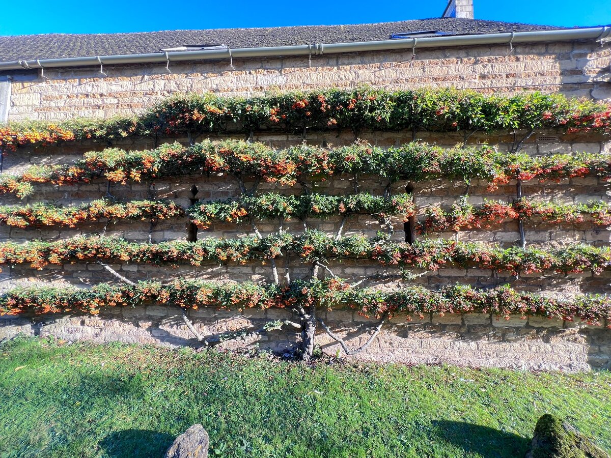 И я начинаю понимать! Это одно растение, а ровные ряды - это сформированные особым образом ветки. И, кстати, на ветках не цветы, а оранжевые ягоды.