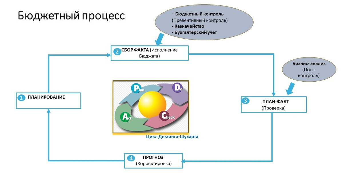 Перед вами общая схема бюджетного процесса, которая показывает составляющие элементы и взаимосвязи со смежными процессами. В проектах по автоматизации Бюджетирования границы проекта обычно охватывают только бюджетный цикл, а смежные процессы, такие как формирование фактических данных, процессы бюджетного контроля и бизнес-анализа, рассматриваются (автоматизируются) на отдельно. Собственно Бюджетный цикл состоит из четырех последовательных этапов Планирование, Сбор Факта, План-фактного анализа и формирование Прогноза. В центре вы видите общий принцип т.н. обратной связи или контрольный цикл Деминга-Шухарта. Планируй, делай, анализируй, корректируй. Это универсальный цикл любой управленческой технологии. Основной его целью является повышение эффективности процесса через положительную обратную связь. Бюджетный цикл идеально ложится на эти процессы, и элементы цикла Деминга-Шухарта естественным образом соответствуют элементам Бюджетного процесса (цикла). Таким образом бюджетный процесс