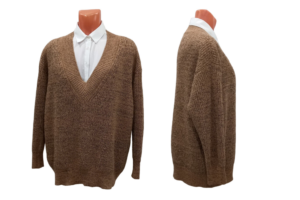 Пуловер прямого силуэта оверсайз с V-вырезом горловины . Пряжа смешанная меринос-мохер-люрекс, примерная толщина 350 метров/100 грамм. Бейка горловины, манжеты и края пуловера резинка 1х1, основное полотно полуфанг (жемчужная резинка). Вырез горловины и пройм выполнен с помощью фасонных убавок многоигольным деккером.
