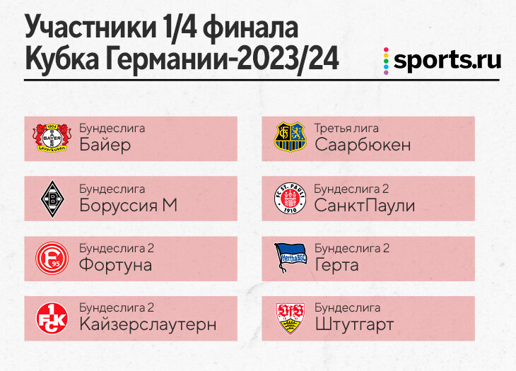 У «Байера» хороший шанс на трофей. После 1/8 финала Кубка Германии в турнире очень мало элиты: дожили всего три команды из Бундеслиги. Остальные пятеро участников – из второй или даже ниже! Герои розыгрыша – «Саарбрюкен», команда из третьей лиги! Это они выбили «Баварию» в 1/16 финала, а теперь и франкфуртский «Айнтрахт». И по делу – недавнего победителя Лиги Европы обыграли 2:0. Уступили во владении, зато активнее били по воротам и в створ. Между прочим, «Саарбрюкен» – участник первого в истории Кубка чемпионов. А до этого команда из Саара даже создавала собственный еврокубок и обыгрывала мадридский «Реал». Действующий обладатель трофея «РБ Лейпциг» проиграл «Вольфсбургу», сам «Вольфсбург» в 1/8 пропустил дальше «Гладбах». «Майнц», «Фрайбург» и «Кельн» проиграли командам второй Бундеслиги. «Аугсбург», «Вердер» и «Бохум» – соперникам из третьей лиги. Остальные клубы высшего дивизиона вылетели в матчах представителей элиты между собой. Фаворит теперь очевиден – «Байер». Это просто одна