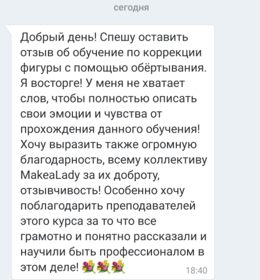 Вот такие отзывы оставляют наши ученицы, прошедшие курс по шоколадному обертыванию. А вот это результаты после 10 процедур шоколадного обертывания. Задать интересующие вопросы, узнать свободные даты обучения, а также записаться на курс можно здесь - https://makealady.ru/onlajn-obuchenie-korrekczii-figury/onlayn-kurs-shokoladnye-obertyvaniya/
