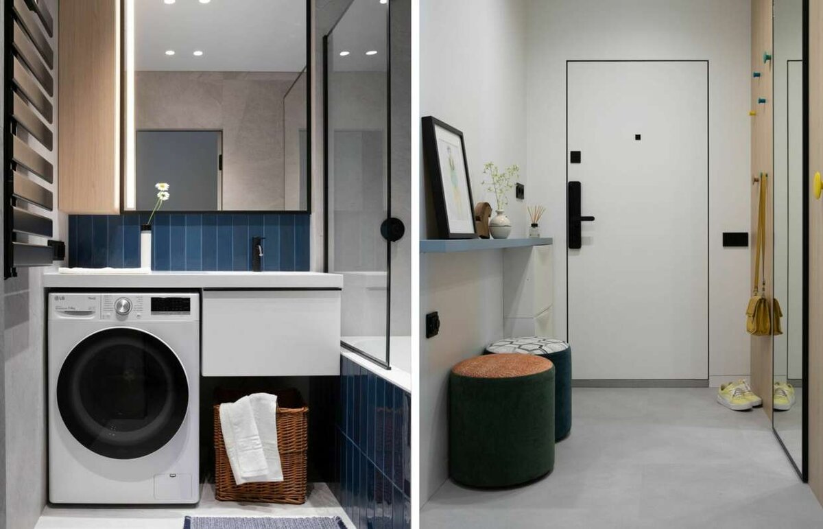 Входную зону не хотелось отделять от всей квартиры, поэтому в ней такая же светлая краска, то же напольное покрытие и мебельные панели, которые переходят в гостиную. На панелях расположились декоративные крючки, рядом — зеркало в пол в черной графичной раме, которая перекликается с черными акцентными элементами в других комнатах.