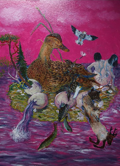 Согласно одному мифу о творении народа саами, мир родился, когда утка отнесла пять яиц; первое — растительность, второе — водная, третье — птицы и рыбы, четвертое — олень, волк и медведь и пятый — человек.