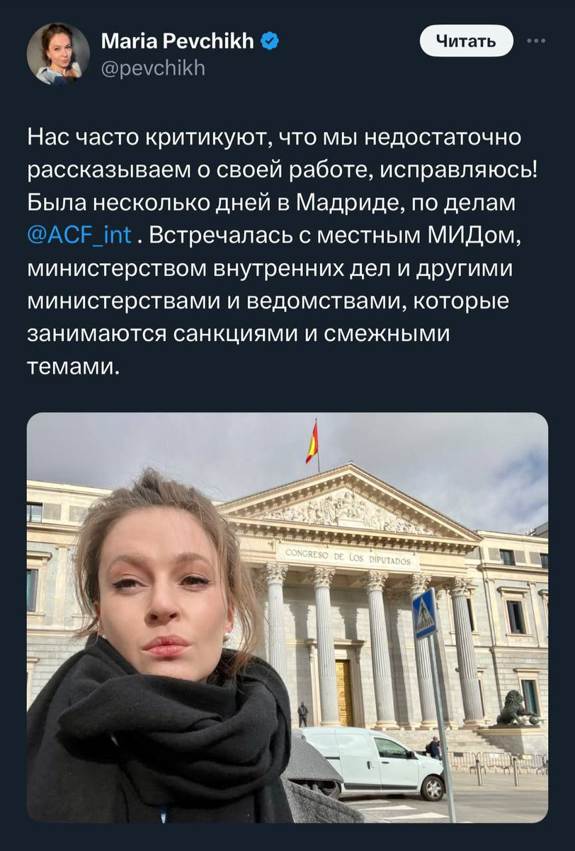 О, давно не виделись. Оказывается, Маша в Мадриде встречалась с местным МИДом. А зачем? Вот хоть что мне говорите, а я слабо представляю себе министерство, которое пропустит Машу в свое, так сказать, логово. А она, оказывается, встречалась не только с товарищами из МДа! Она еще забежала в Министерство внутренних дел, и еще в некоторые министерства и ведомства, чтобы пообщаться с официальными лицами. Она даже сфотографировалась на фоне какого-то здания с флагом, чтобы проиллюстрировать свою деятельность! А что? Ну, не с министром же ей фотографироваться, правда? Мид в Мадриде, правда, немного иной, чем на фото у Маши, но это, очевидно, какое-то другое министерство, в которое она вхожа. Мало ли с кем можно поговорить по поводу санкций, правда? Одна ездила или с девчонками? Вместе - оно ж всегда веселей. Про Юлю давно не слышно, как фигуру оленя за Лешу получила - все, как отрезала. Наверно, тоже по министерствам ездит. Как Маша все успевает? Она же там вроде с женами мобилизованных устр