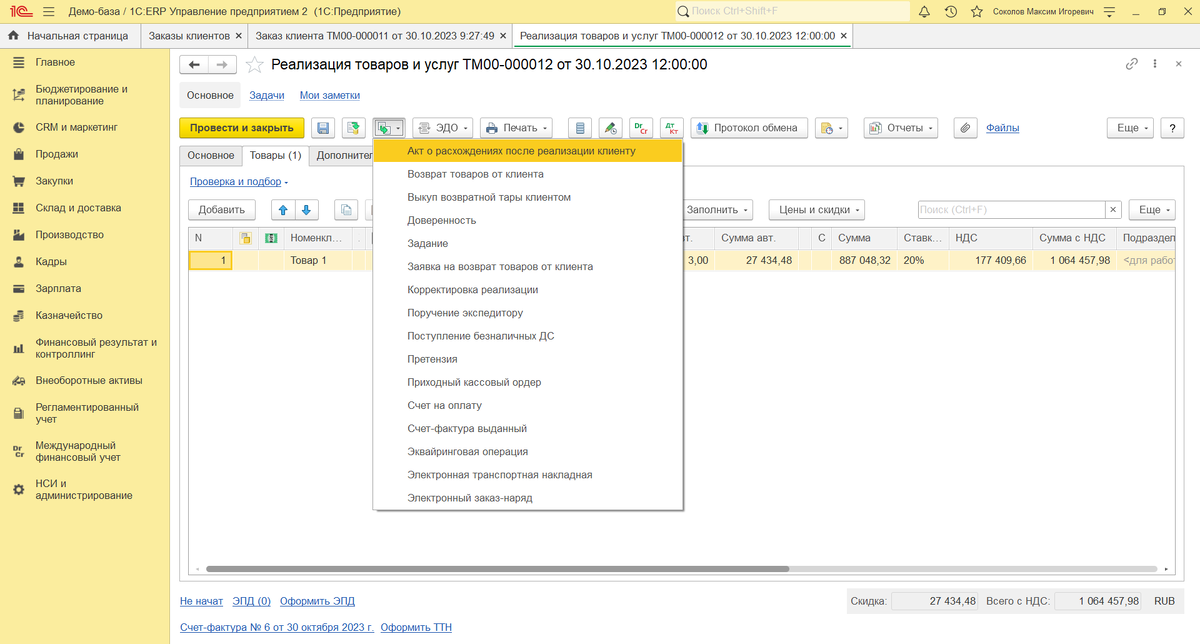 В оформлении данной ситуации как раз и поможет документ «Акт о расхождениях после реализации», который оформляется на основании документа продажи «Реализация товаров и услуг»: