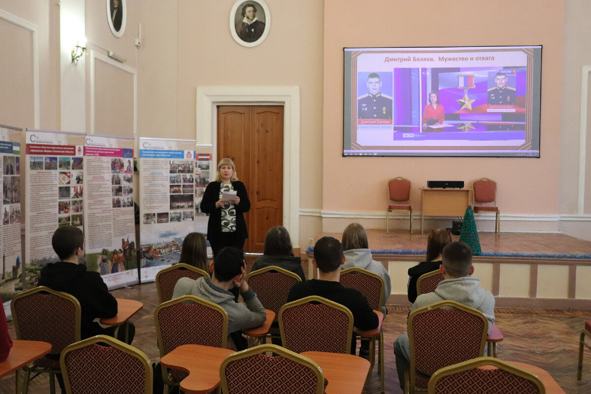 7 декабря 2023 года в Смоленской областной универсальной научной библиотеке им. А. Т. Твардовского в преддверии Дня Героев Отечества для студентов Смоленской академии профессионального образования состоялся исторический хронограф «Герои нашего Отечества», подготовленный сотрудниками отдела общего обслуживания. В ходе встречи ребята узнали, что дата праздника приурочена к дню христианского святого, великомученика Георгия Победоносца, и познакомились с его христианским подвигом. Также узнали об истории появления наград в России, начиная от ордена святого Георгия до главной награды нашей страны – медали «Золотая Звезда». На мероприятии вспомнили имена героев, живших в разные эпохи и принадлежавших к разным социальным группам. Эти люди совершили много достойных дел, но ребята услышали только о тех деяниях, которые отмечены высшими наградами. 24 февраля 2022 года президент России Владимир Путин объявил о начале специальной военной операции. Доблесть, бесстрашие и героизм всегда отличали наш
