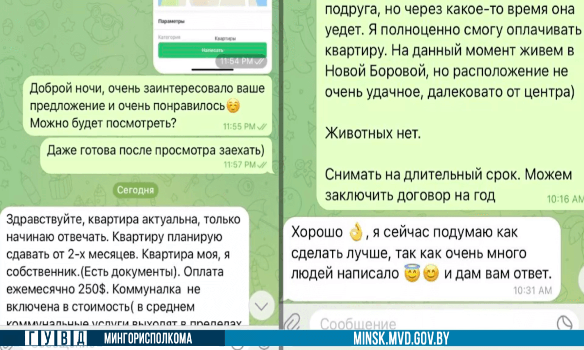 Как работает схема, в МВД показали на примере одной из обманутых белорусок: "Так, в Центральное РУВД обратилась девушка, которая в сети нашла объявление об аренде квартиры, хозяйка которой просила внести предоплату в размере 30%. Заявительница согласилась и перевела ей 200 белорусских рублей".