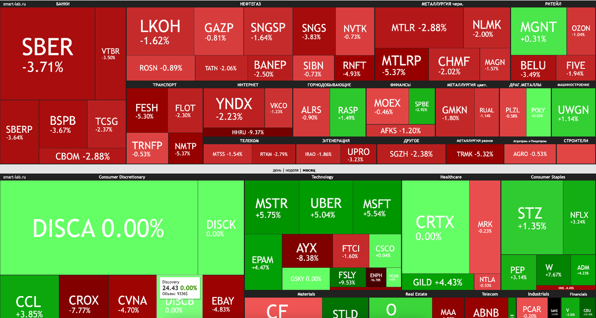 На торгах в Москве снижение, рубль может стабилизироваться вблизи 93 за доллар 📈 Российский рынок акций снизился. В среду индекс МосБиржи не смог сохранить утренний позитивный настрой и по итогам основной сессии отступил на 1,6%. Динамику рынка во многом определили акции Сбера, занимающие значительную долю в составе индекса МосБиржи: котировки банка ощутимо скорректировались после роста накануне. Основным событием на рынке стал День инвестора Сбера: банк представил прогнозы на 2024–2026 годы, основные положения дивидендной политики (выплата 50% чистой прибыли) не изменились. Также на индекс МосБиржи вновь негативно повлияли нефтяные котировки. 🔻 На рынке США основные индексы незначительно опустились. По данным ADP, количество рабочих мест в частном секторе американской экономики в ноябре выросло меньше, чем ожидалось, что указывает на «охлаждение» рынка труда. Тем не менее инвесторы пока не спешат открывать длинные позиции перед публикацией официального ноябрьского отчета по рынку т