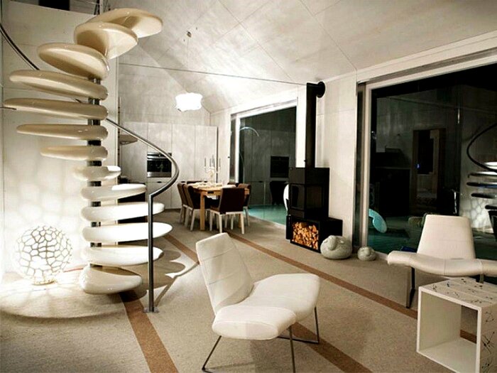 Всем привет! В сегодняшней статье мы покажем 10 лестниц, которые отличаются оригинальным внешним видом и являются центральной частью интерьера. Желаем всем приятного чтения! 1. Винтовая лестница из березы. Сочетание извилистых перил из металла и лакированной березы выглядит очень оригинально и эстетично. Отличное решение для современной двухэтажной квартиры. 2. Лестница из стекла и металла. Следующее изделие в нашем списке — невероятная по своей красоте и исполнению лестница. Кованые перила и стеклянные ступени придают изделию эстетичный внешний вид и делают его системообразующим элементом интерьера. 3. Лестница с перилами в графическом стиле. Самое изделие имеет вполне стандартный дизайн. Главная изюминка лестницы — перила. Графические перила выполнены из светлого дерева. Они не только выполняют свою прямую функцию, но и могут послужить местом хранения для малогабаритных вещей. 4. Винтовая лестница из дерева и металла. Винтовая лестница — лучшее решение для маленького простран