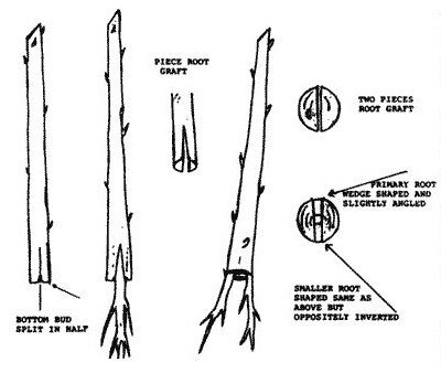 Эту прививку можно сделать, используя целый корень или кусочки корней (см. рисунки). Для прививки с целым корнем желательно, чтобы и привой, и корень были одинакового размера. Обычно используется прививка с плетью и язычком, но клиновидные или седловидные прививки тоже могут быть вполне удовлетворительными.