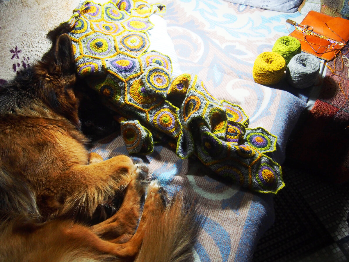Так что вяжу и подшиваю мотивы в любую свободную минуту. Сначала я даже потеряла надежду, что смогу закончить плед вовремя, но теперь, учитывая, что осталось связать немного мотивов, пришить мотивы для формирования двух углов (два готовы), и обвязать, думаю, что есть все шансы успеть доделать плед к концу проекта.