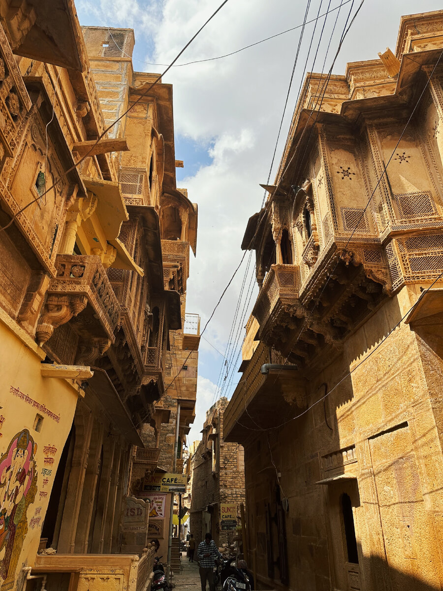 В розовом городе мы с Катей уже побывали. Пришло время золотого. Джайсалмер находится посреди Великой Индийской пустыни Тар. Это один из древнейших городов Индии, основанный в 1156 году. Дома здесь построены из жёлтого песчаника и имеют янтарный оттенок, именно поэтому его прозвали золотым. Вдали от цивилизации, этот город сохранил своё величие и индивидуальность. Почти вся застройка состоит из хавелей - зданий, принадлежащих зажиточным купцам, а их убранство подстать любым дворцам. Изысканность и красота в каждом строении, невероятная резьба по камню. А янтарный цвет придаёт ещё большего величия и восточного шарма. Гуляя по старому городу, который находился в крепости, мы ходили с открытыми ртами, не веря, что все эти строения являются обычными жилыми домами и гостинцами, а не памятниками архитектуры. Здесь чистые улицы, за два дня прогулок мы не увидели ни одной кучи мусора. Люди не такие назойливые, даже тук-тукеры не бегут к тебе толпой, пытаясь усадить в свой супер джет. На