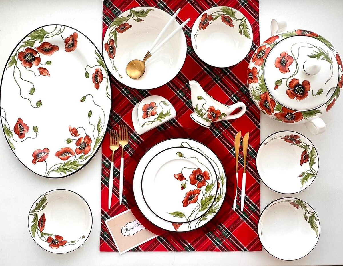 Настроение праздника во многом создает красивая сервировка стола. В связи с этим у меня интересная идея. Сервиз на 4 персоны “Маки”, который можно использовать для празднования Нового года в узком семейном или дружеском кругу. Красные распустившиеся маки на фоне белоснежного фарфора, яркий сервиз для создания особой праздничной атмосферы. Главная хитрость в декоре стола. Достаточно использовать в качестве фона-подложки традиционную красно-зеленую клетку, и сервиз с цветами Прованса легко превращается… в зимний, новогодний. Универсальный и незаменимый). Помним, что после зимы будет весна, а затем лето! Красный и зеленый вообще традиционные новогодние и рождественские цвета. А клетка дополнительно “намекает”, что Новый год - торжество семейное. Сервиз существует в единственном экземпляре, это единственная готовая работа в наличии, доступна для заказа уже сейчас.