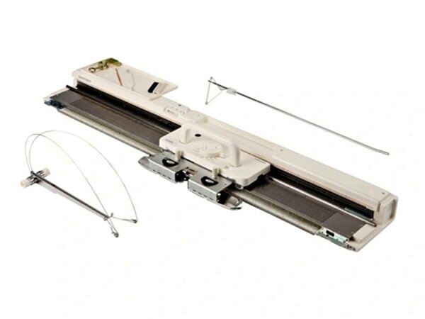 Вязальная машина Silver Reed SK840. На фото игольница с установленной кареткой с плечом, нитенатяжитель, стойка нитенатяжителя - основные составляющие машины.