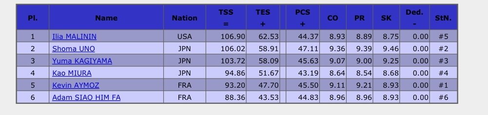 Као Миура ошибся на выезде с четверного сальхова. Он справился, но планировал сделать каскад и тулуп не удалось добавить. Он махнул ногой, как будто пытаясь сделать тулуп. С сольным трикселем справился. За каскад четверной тулуп-тройной тулуп пришлось побороться. Приземлил, но с трудом и не самым уверенным выездом. 94.86.