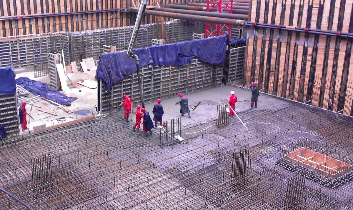 Стены котлована укрепляют по периметру армированным бетоном. При строительстве зданий от 20 этажей обязательно используют сваи, глубина которых может составлять и 50 метров, диаметр – полтора. Толщина фундаментной плиты может достигать четырех метров.