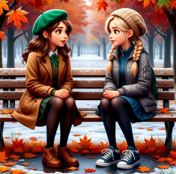 Лера и Света сидели на скамейке в парке. На обеих были длинные тёплые куртки тёмно-синего цвета. Седые волосы скрывались под пуховыми платками, чуть выбиваясь у самого верха.