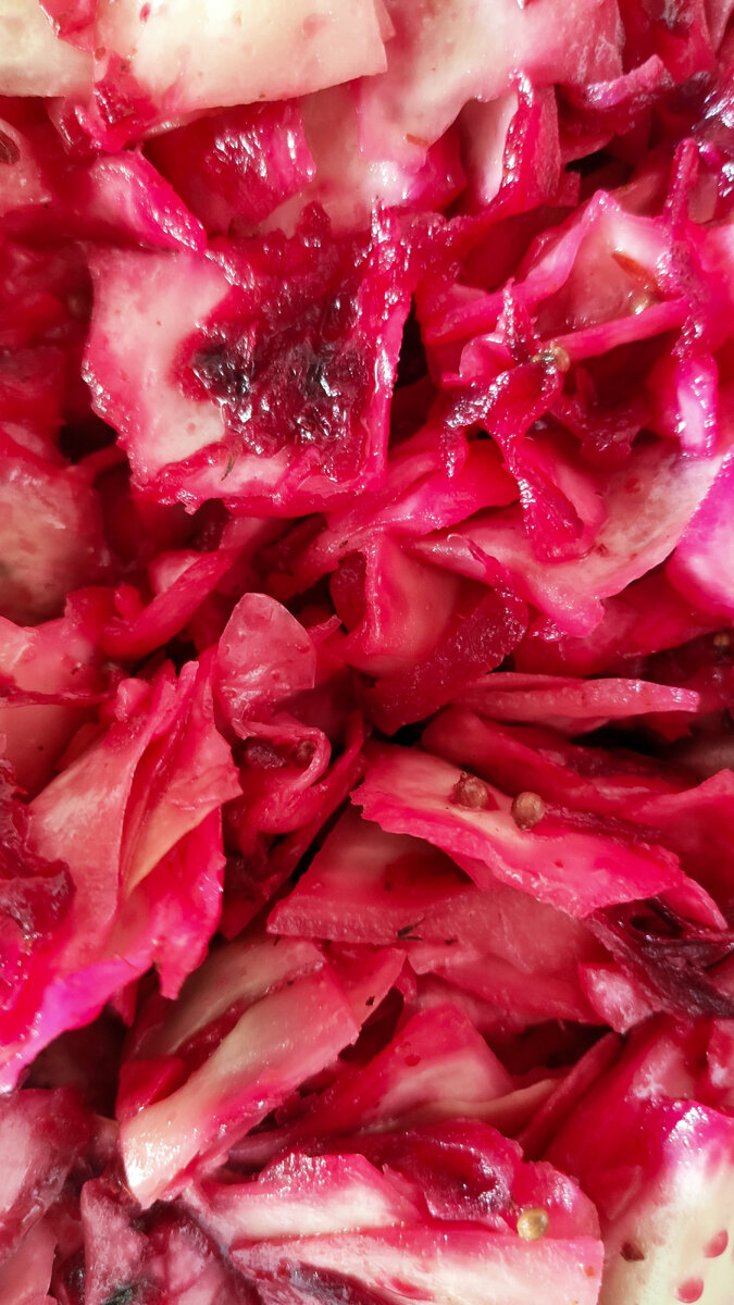 Сегодня приготовим ароматную капусту по-корейски, оказывается можно готовить всё по-корейски, было бы желание и такая же любовь к таким блюдам, как у меня 😅 Итак, нам понадобится: Первым делом, конечно же, режем капусту. Нарезаем её на квадратики см 3 И обязательно разделяем на слом, чтобы она быстрее замариновалась и прокрасилась. Далее трём свёклу на терке и добавляем к капусте. Добавляем соль и тщательно жмакаем руками, до появления сока. Отставляем в сторону на 30-60 минут Спустя положенное время добавляем к салату сахар, чеснок и всё специи с кориандром, сверху заливаем уксусом. На сковороде прокаливаем растительное масло. И так же заливаем им салат. Важно!! Заливаем прям на специи. Так они раскроются ещё лучше. Когда масло чуть подостынет, надеваем перчатки и жмакаем в течении минут 5. Почему в перчатках? Это мой вам совет) в жизни мы обычно не замечаем маленьких царапинок на руках, а в этой смеси вы их почувствуете на всё 100, плюс, я очень сильно ещё заехала себе капу