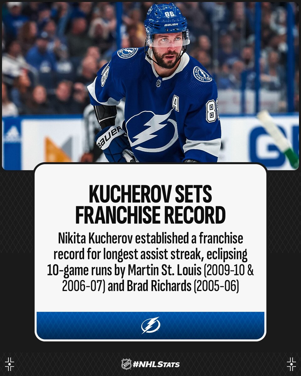 В среду, в матче между «Тампой» и «Питтсбургом» (в котором «Лайтнинг» отпраздновали победу со счетом 3:1, прим. – Ред.) Никита Кучеров забил свой очередной гол и оформил очередной ассист. Тем самым он набирает очки уже в 11 матчах подряд. Более того, во всех этих 11 матчах с очками он записывал на свой счет результативные передачи. 11 игр с ассистами – это новый рекорд клуба. Прежний принадлежал Мартену Сен-Луи, у которого таких встреч было 10. Ход Кучерова по турнирной дистанции в этом сезоне буквально заставляет раскрывать рты от изумления, и прямо сейчас все выглядит так, что именно он является лучшим хоккеистом НХЛ. Никита лидирует в лиге по очкам и не может не считаться главным претендентом на «Харт Трофи». Автор: Henry Yoho