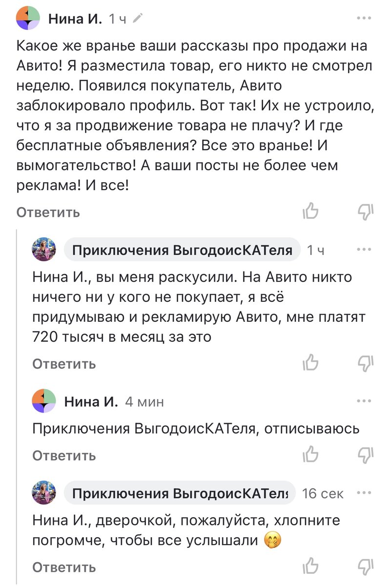 Меня тут недавно вывели на чистую воду! 😱 Раскусили, так сказать. А вообще, я просто обожаю эти полные отчаяния комментарии, которые оставляют те, у кого вода под лежащий камень сама по себе никак не течёт, но делать ничего для изменения ситуации они и не собираются. Ведь проще сказать, что все кругом врут, а заработать на продаже ненужных вещей через Авито невозможно.