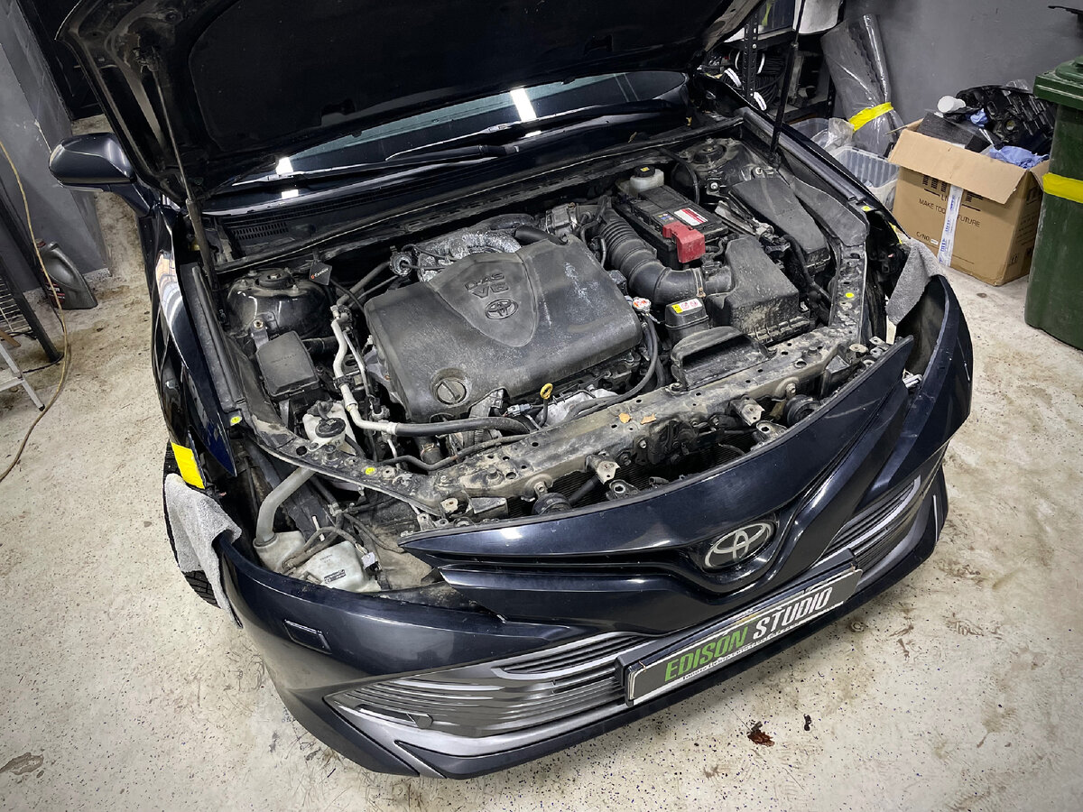 Всех приветствую! Сегодня в стенах нашей студии на комплекс по улучшению света фар Toyota Camry 70. Штатно на автомобиле уже установлена Full LED оптика, которая не удовлетворяет потребности владельца по свету. Будем исправлять данную ситуацию и заменим родные Bi Led линзы на более производительные модули. Приступаем к разбору автомобиля. Демонтируем бампер и фары. Снимаем с фар блоки управления, на всякий случай помечая правую и левую сторону. Выкручиваем саморезы по периметру корпуса, которые удерживают стекло. Отключаем шлейф ДХО, который скрывается под технической заглушкой. Далее отделяем стекла от корпусов, на данных фарах у нас мягкий герметик - «лизун», который не требуется нагревать. Внутри фар ничего необычного, конструкция максимально примитивная. Штатная Bi Led линза Koito. Демонтируем раму и чистим старый герметик. Делаем это легко и непринужденно. Приступаем к замене линз. Для этого нам понадобятся специальные переходные рамки и «декодеры», чтобы новые модули работали ко