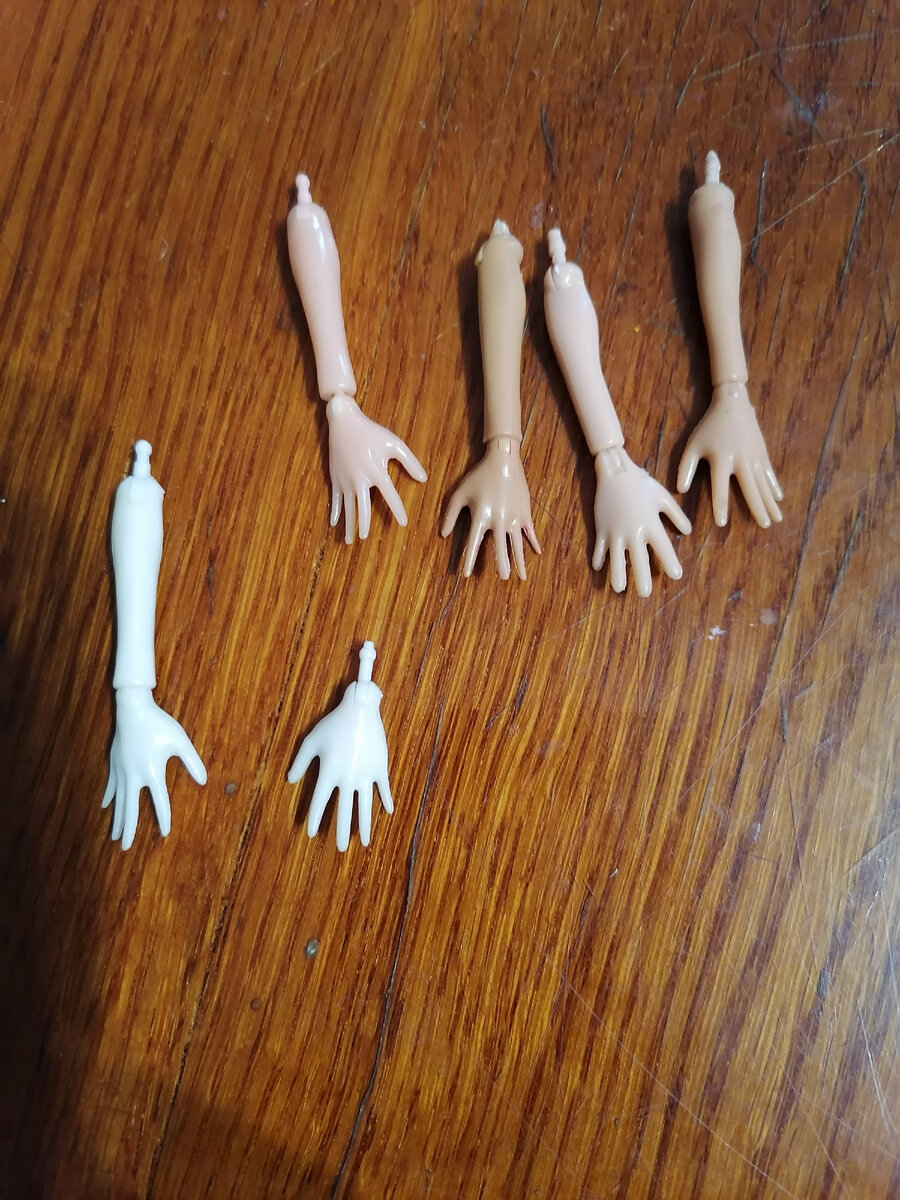 Здравствуйте! Пришли ручки моим куколкам. Заказала немного побольше, думаю пусть будут, мало ли может ещё куклят принесут 🤣🤣🤣. Конечно они немного разнотонят, но не критично Двум девочкам поставила ручки. Одной прямо хорошо подошли, а другой поменяла прямо с локтя. Думаю приодену и не будет заметен разнотон! А вот Базирон мне пока не помог, как были пятна на двух куклятах, так без изменений, подожду ещё немного! А у меня исполнилась маленькая мечта! Нашла куколку периода СССР, рост её 9 см, но у неё нет ручек, хочу сделать из запекаемой глины. Искала такую очень долго, память из детства! В то время не старались кукол оставлять. Отдавала соседям у кого маленькие детки. Так и потерялись эти куколки. А теперь цена такой целой куколки от 2500 до 5000 колеблется. Фабрика Аским, из колкого пластика. Так они выглядят, если целые Такая куколка без рук мне обошлась в 400 рублей, сделаю руки обязательно покажу. У этой куколки волосики подправила и тапочки подрисовала. Вот такие новости
