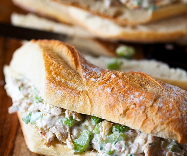 ИНГРЕДИЕНТЫ/16 ПОРЦИЙ: 2 стандартных багета, 700 г куриной грудки, 1,5 ч.л дижонской горчицы, 50 г изюма, 100 г майонеза, 50 г зеленого лука, 100 г сельдерея, карри на кончике ножа, 60 г жареного миндаля, соль, перец, соус табаско.