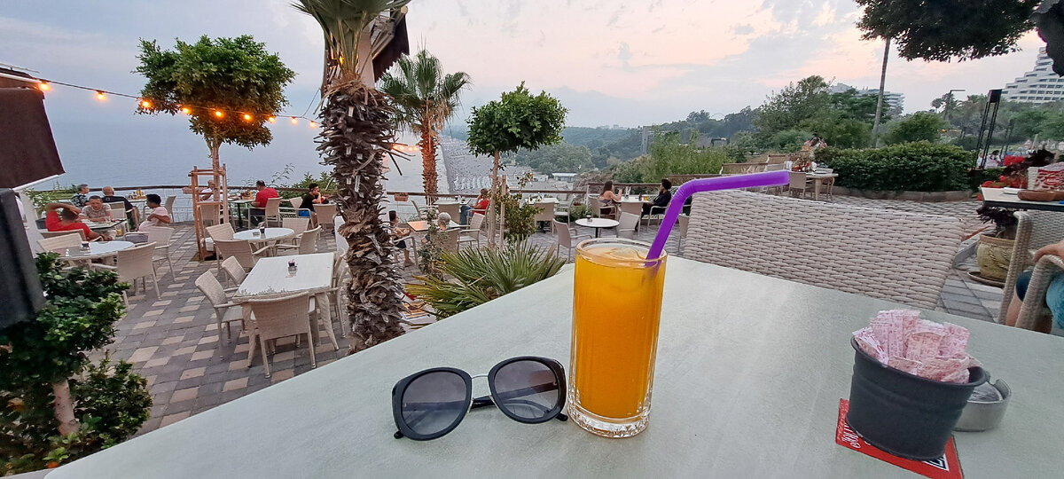 Привет, друзья! В Анталии есть одно кафе на Коньяалты с прекрасным видом на море! Вечером атмосфера очень романтическая. Сверху просматривается вся набережная, а если повезет, то и красивый закат. Музыка в кафе очень приятная. Вечером включаются в кафе огоньки. Очень атмосферно и уютно. Можно выпить какой-нибудь фреш, холодный кофе или чай. Много вкусных десертов! Порции еды очень хорошие, отличные цены. Всё очень вкусно. А расплачиваться можно долларами, если потребуется сдача, то дадут по хорошему курсу. Доходили мы до него пешком прямо с пляжа, идти прилично, но если как у нас это вечерняя прогулка, то просто отлично! Рядом ездят трамвайчики, как я поняла, у них здесь конечная. Вечером нереально красиво, рекомендую! адрес: Анталья, Муратпаша, улица Коньяалты, 25/22 п.с. Из кафе видно даже колесо обозрения, горящее в ночи. Ниже видео, которое я уже выкладывала из кафе с его атмосферой. мои обзоры других кафешек Анталии ниже: Менемен и турецкие сладости в кафе MADO. Коньяалты. Анталь