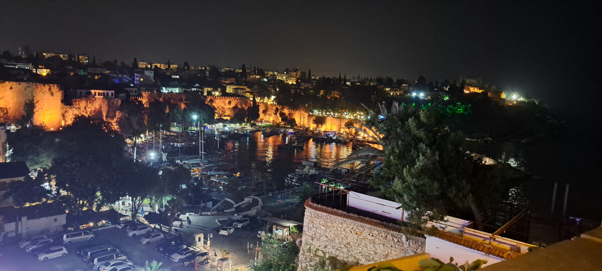Очень романтическое место! Привет, друзья! Сегодня покажу очередное турецкое заведение, где можно неплохо поесть, а также насладиться красивым видом. Попали мы сюда случайно. Заведение находится в самом центре Анталии, в районе Муратпаша, по адресу: ул.Джумхуриет, 67 (Cumhuriyet Cd 67), ровно напротив пляжа Мермерли. А вот и само название заведения. Кафе очень длинное и в нём имеется много мест с видом прямо на порт. Очень понравились цены для кафе с таким видом, средние. Мы взяли рыбку, салатик и сок. Напротив, на крепостной стене, постоянно бежала светящаяся строка с различными поздравлениями (как мы поняли), точно не знаю. Но там было про любовь( может быть поздравления со свадьбой?!). Выглядит в темноте это очень интересно. По меню можно заказать и рыбу и мясо, так что рекомендую к посещению! Правда вечером много посетителей, несмотря на большую вместимость кафе, почти все столы заняты, особенно с видом. ВСЕМ СПАСИБО ЗА ПОДПИСКУ👍, ПРОСМОТР👀, ЛАЙКИ❤️ И КОММЕНТАРИИ✍️! Видео из кафе