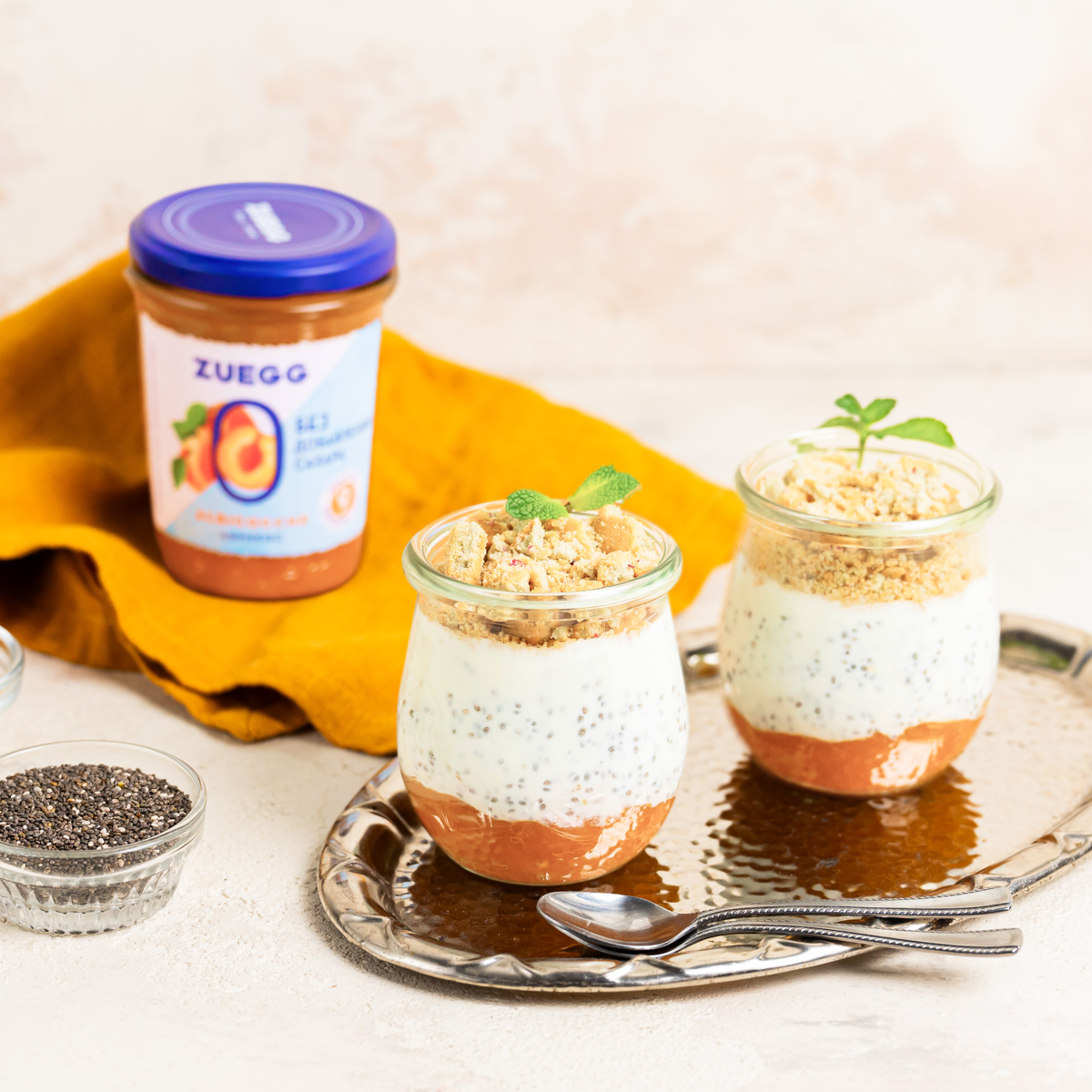 А самое приятное, что он безумно вкусный и содержит всего 160 калорий. На 4 порции вам понадобится: — 320 мл напитка из кокосового молока — 80 г семян чиа — ½ ч. л. экстракта ванили — Абрикосовый конфитюр Zuegg без сахара — Печенье (по желанию) Совет: пудинг можно приготовить с любым другим молоком, например с миндальным, соевым или овсяным, а сверху добавить любимые фрукты, орехи, семена или другой конфитюр. Главное помните, что пропорция должна быть: 1 часть семян чиа к 4 частям молока.