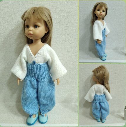 Вяжем комбинезон спицами для Паолы Рейна 32 см. Для работы использую спицы №3 и пряжу "Перхотка. Детская новинка". Верх. Набрать белой ниткой 60 петель. Вязать 20 рядов лицевой гладью ( в нечетных рядах - лицевые петли, в четных - изнаночные). В 21 ряду для гордовины закрыть среднее 10 петель (кромочная, 24 лицевые, 10 закрыть, 24 лицевые). Далее каждую полочку вяжем отдельно, симметрично. 4 ряда оставшиеся на спице 23 петли лицевой гладью (всего 25 петель, 2 из которых кромочные). Затем в каждом 2 ряду с края полочки для запаха прибавляем по 1 петле 10 раз. Итого должно получится 35 петель, которые в следующем лицевом ряду, где уже нет прибавлений, закрыть. Получившиеся полотно отпарить утюгом. Низ. Набрать 44 петли голубой нитью. Далее 5,5 см вязать резинкой 1х1 (1 лицевая,1 изнаночная). Далее в лицевом нечетном ряду прибавляем 42 петлю. Кромочная, накид, лицевая, накид, лицевая, накид, лицевая, накид и так до конца ряда. В изнаночном ряду все петли, в том числе и накидные, провяза