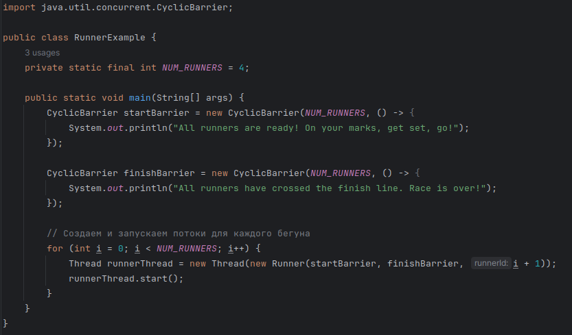 В Java класс CyclicBarrier предоставляет механизм синхронизации, который позволяет группе потоков дождаться друг друга в определенной точке исполнения, прежде чем продолжить выполнение. Он особенно полезен, когда несколько потоков выполняют части задачи и должны синхронизироваться в конечной точке перед тем, как продолжить выполнение. Принцип работы CyclicBarrier заключается в том, что он ожидает, пока все участники (потоки) не достигнут барьера, и только после этого он выполняет заданное действие (заданный Runnable). После этого барьер снова становится доступным для использования. Вот пример кода с использованием CyclicBarrier. Представим, что у нас есть группа бегунов, и они должны стартовать одновременно. После старта они бегут определенное расстояние, а затем ожидают, чтобы все остальные бегуны добежали до этого же места, прежде чем продолжить. В этом примере RunnerExample является основным классом, в котором создаются барьеры и запускаются потоки бегунов (класс Runner). Класс Run