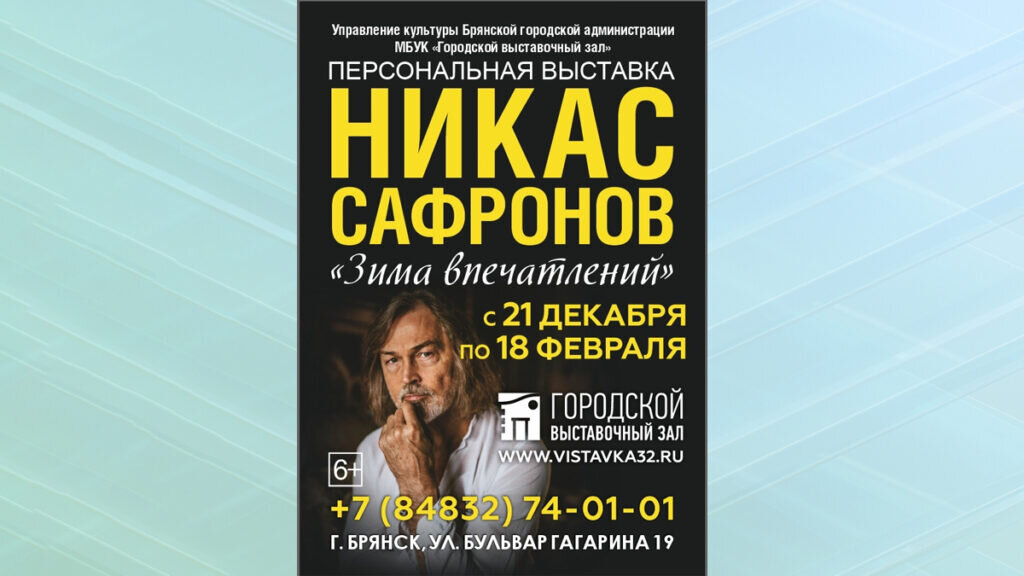 В Брянске откроется персональная выставка «Зима впечатлений» заслуженного художника Российской Федерации, академика Российской академии художеств, профессора Никаса Сафронова. Экспозиция будет представлена в Городском Выставочном зале с 21 декабря 2023 года по 18 февраля 2024 года. Никаса Сафронова можно назвать одним из самых известных российских живописцев нашего времени. По данным Всероссийского центра исследований общественного мнения «ЛЕВАДА-ЦЕНТР» на сегодняшний день Никас Сафронов входит в десятку лучших современных художников мира. Основная часть работ Сафронова находится в частных собраниях и музеях многих стран мира. Среди поклонников творчества художника — Алла Пугачева, Софи Лорен, Ален Делон, Пьер Карден, Дайана Росс, Монсеррат Кабалье, Мадонна, Никита Михалков, Стивен Спилберг, Тина Тернер, Жан-Поль Бельмондо, Элтон Джон, Мик Джаггер, Пьер Ришар, Ричард Гир, Элизабет Тейлор. Работы художника отличаются изящной легкостью, манящим пространством и одухотворенностью. Они по