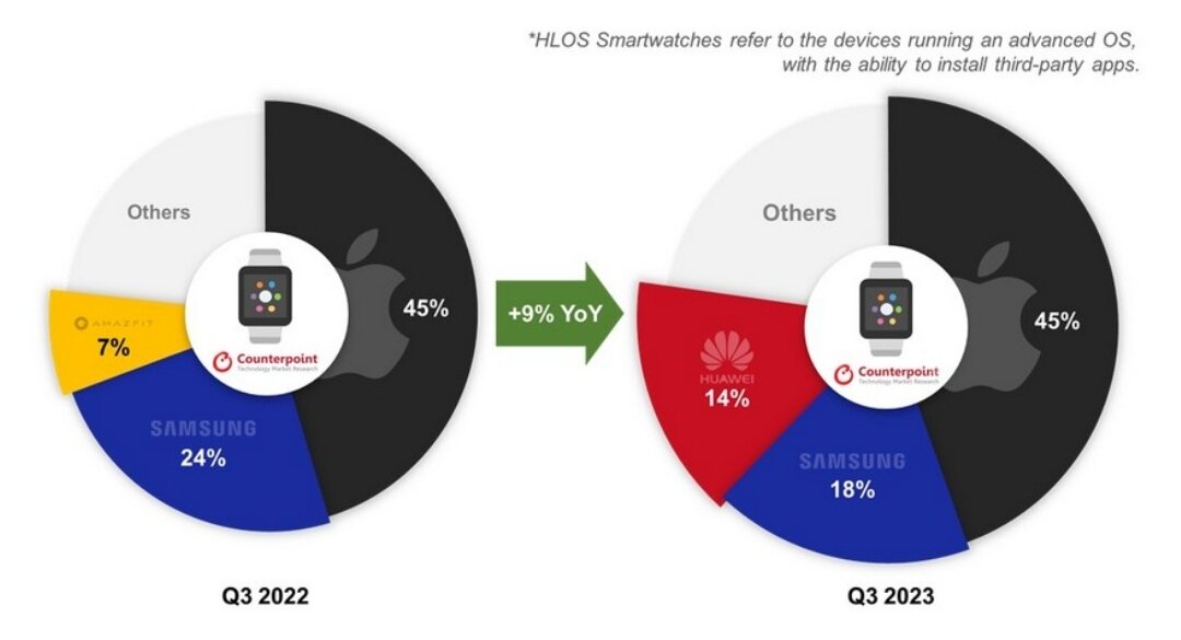 Исследовательская фирма Counterpoint Research представила отчет о мировых поставках смарт-часов за третий квартал 2023 года. Согласно данным, в сравнении с аналогичным периодом прошлого года рынок смарт-часов вырос на 9%. Этот период также отмечен значительными изменениями в рейтинге ведущих производителей. Аналитики обратили внимание на то, что несмотря на мировой экономический спад, рынки потребительских устройств, включая смартфоны, продолжают стагнировать. В контексте этого общего тренда рынок смарт-часов продемонстрировал увеличение поставок как в премиальном, так и в бюджетном сегментах в течение двух последних кварталов. Этот рост обусловлен успешными показателями индийского рынка, где выделяется бренд Fire-Boltt, а также выдающимися результатами HUAWEI на китайском рынке. HUAWEI сумела увеличить поставки смарт-часов на внушительные 56% за год, в результате чего заняла третье место с долей рынка в 14%. Основными катализаторами роста стали модели серий Watch 4 и 4 Pro, а также Wa