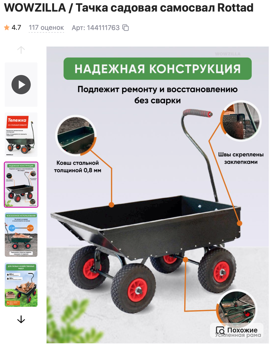 К тому же, соблазнило меня то, что тележка является мини-самосвалом, то есть, при опрокидывании груза её передние и задние колеса сдвигаются друг к другу без особых усилий.