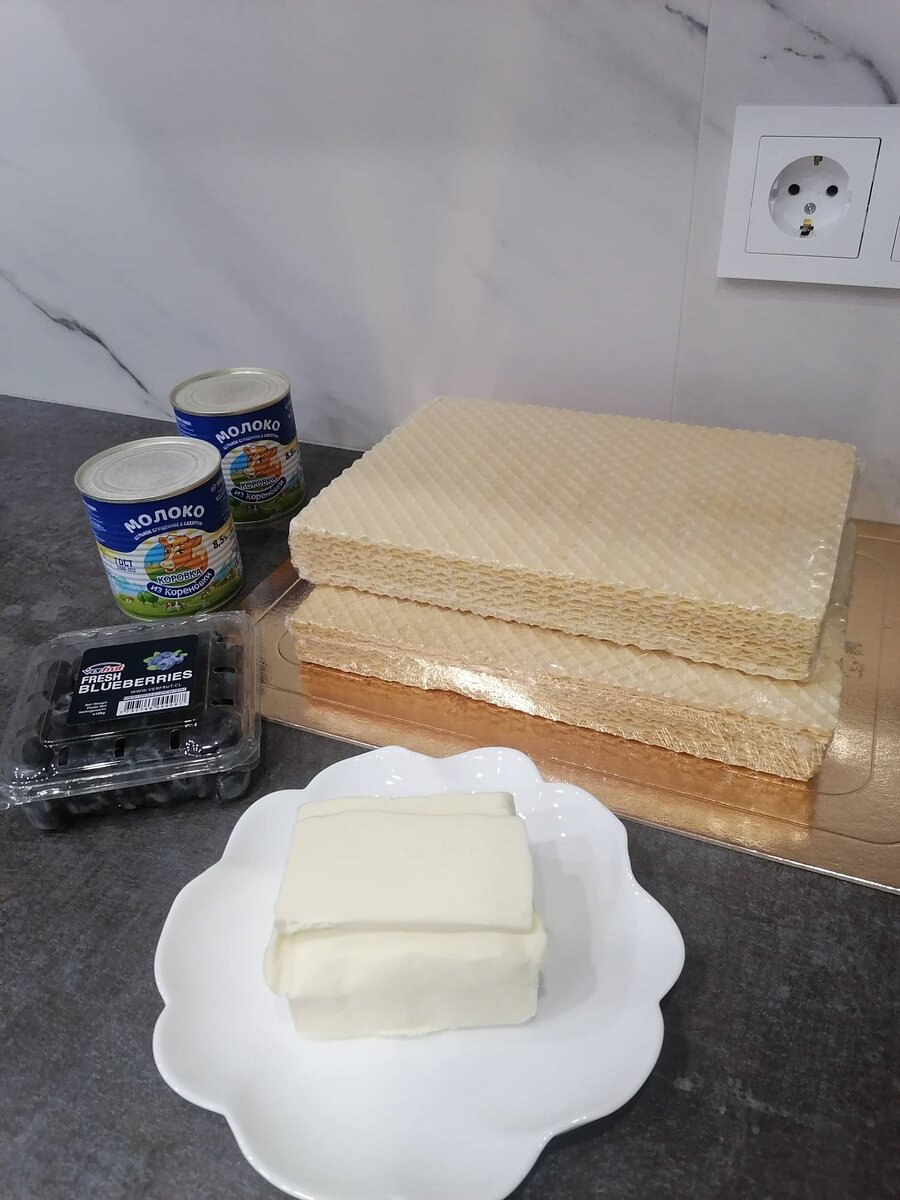 Промазать каждый корж кремом. Верхний оставить без крема. Положить на него груз и поставить для пропитки в холодильник на ночь. Далее намазать кремом верхний корж и украсить по желанию ягодами /шоколадом/тертым вафельным коржом. Приятного аппетита!