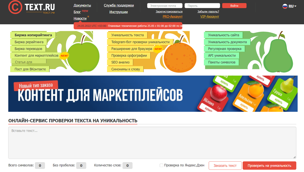 Как мы уже говорили раньше, первым делом нужно проверить ваш отредактированный текст на уникальность. Сервис для проверки текста на уникальность мы указали в самом начале разбора схемы. После того, как вы проверите текст, можно переходить к его публикации на продажу.