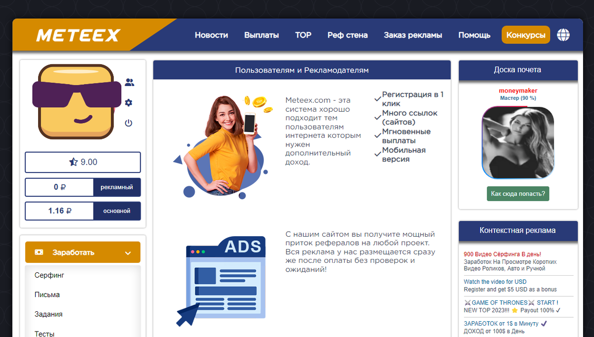 В этом обзоре я расскажу о новом буксе METEEX, который был запущен 19 июля 2023 года. Букс похож на AVISO, но имеет свои особенности. Регистрация и настройки Для регистрации в буксе нужно указать логин, пароль, почту и возраст. Также можно указать пол и поставить аватарку. В настройках также нужно указать платёжные данные. Задания В буксе METEEX доступны следующие способы заработка: Стоимость заданий варьируется от 20 копеек до 500 рублей. Рейтинг В буксе METEEX есть рейтинг, который влияет на реферальную программу. Рейтинг можно повысить, выполняя задания или покупая его за деньги. Вывод средств Минимальная сумма для вывода средств составляет 5 рублей, вывод мгновенный. Вывод возможен на следующие платёжные системы: Заключение Букс Mix является новым проектом, но имеет ряд положительных моментов: Однако есть и некоторые минусы: В целом, букс METEEX можно рассматривать как перспективный проект. Ссылка для регистрации, для получения бонусов: METEEX