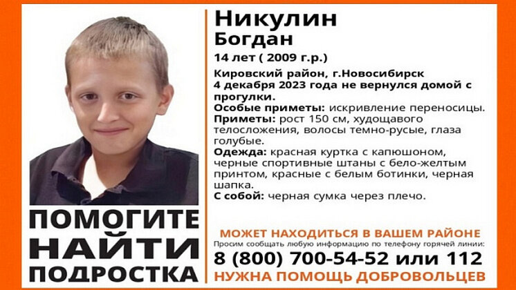 В Кировском районе Новосибирска благополучно завершились поиски 14-летнего Богдана Никулина, местоположение которого было неизвестно с 4 декабря 2023 года. В тот день подросток ушел из дома на прогулку, но обратно так и не вернулся. Тогда на поиски мальчика отправились волонтеры поисково-спасательного отряда (ПСО) «ЛизаАлерт» и сотрудники полиции. «Найден, жив! Спасибо всем, кто распространял информацию в сети», – кратко написали волонтеры отряда «ЛизаАлерт» в своей официальной группе в социальной сети «ВКонтакте». Ранее «Вести Новосибирск» сообщали, что в Новосибирске завершили поиски пропавшего 55-летнего Ирека Шакирова, местоположение которого
