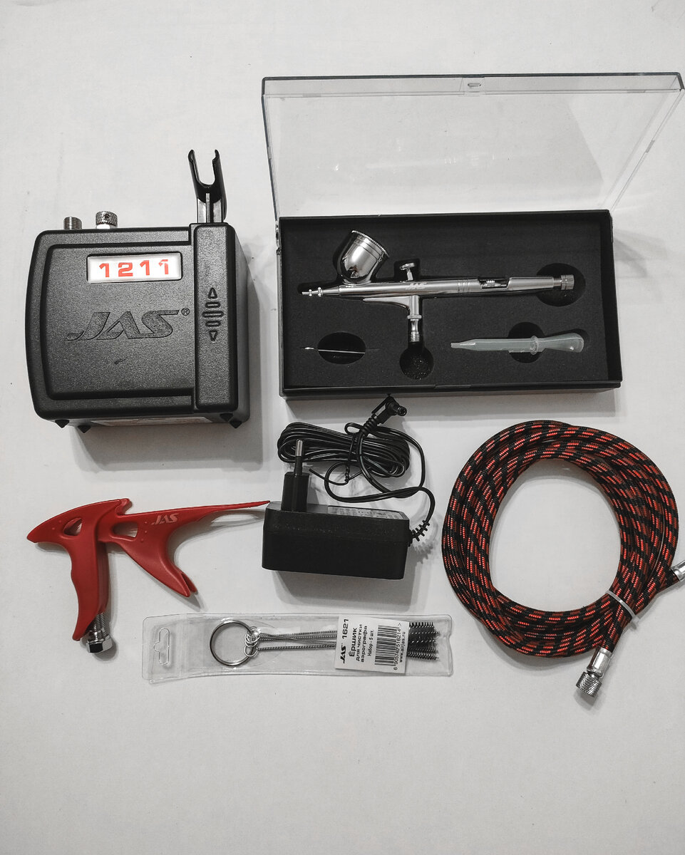 Честно говоря, мне потребовалось долгое время, чтоб просто дорасти до данного этапа. В начале пути мне хотелось работать с минимумом затрат и дорогих инструментов, а вот когда перестало хватать времени делать всё - тогда и голова включилась. Вообще-то машины должны делать всё за челове... ладно, всё-таки это канал про унижение термопринтера 🙃 Значит так, аэрограф. Самый простой, для моделистов. Стоил примерно 5000р и был взят на пробу с лёгким недоверием. В наборе - мини-компрессор, шланг, провод питания, сам аэрограф, держатель для него и щёточки для чистки. Ещё очиститель - по сути, красивая банка с умным названием, чтоб продувать туда сопло через отверстие. Куда-то делась на момент съёмки (как только что-то трогаю, оно теряется, да). Ну что ж, поехали. Здесь хочу продемонстрировать, насколько аэрограф соответствует именно моим требованиям. А я хочу именно упростить работу с трафаретами. Краску я беру Pebeo белую для ткани, и развожу водой примерно 1:1. Заливаю в резервуар на аэр