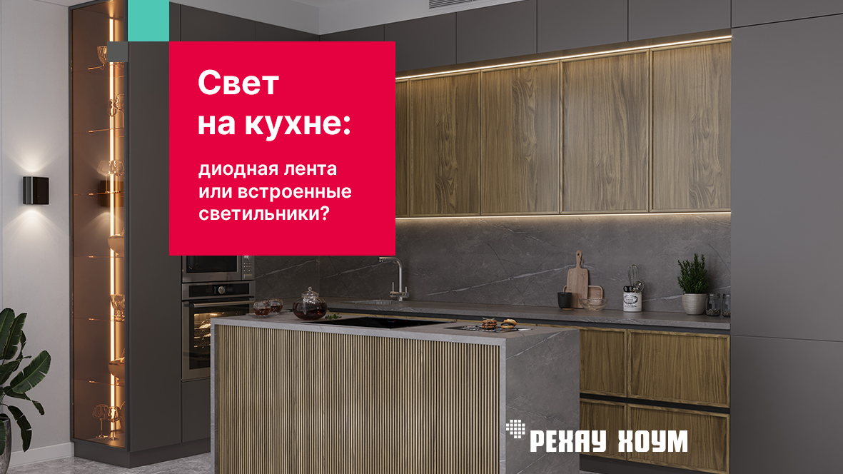 Кухонный гарнитур требует отдельных источников света, потому что навесные ящики могут загораживать освещение рабочей поверхности. Можно выбрать встроенные светильники, которые располагаются непосредственно над кухонным гарнитуром или проложить диодную ленту под верхним рядом. Особенность точечных светильников в том, что лучше всего их предусмотреть на стадии проектирования кухни. Обычно такие лампы встраиваются в подвесной потолок или верхний карниз. Одной лампочки достаточно для освещения квадратного метра, расстояние между ними должно быть не менее 30-40 см. При выборе диодной ленты принципиальна плотность диодов на ленте: сколько их и как часто расположены. Для подсветки рабочей зоны оптимально будет 120-240 диодов на метр, для декора и интерьерного освещения достаточно 30-60 диодов. Есть одноцветные и многоцветные варианты диодной ленты. Для кухни подойдет один цвет теплой, нейтральной или холодной температуры. Разноцветная подсветка лучше смотрится в качестве декора. Резюмируем те